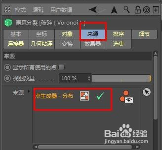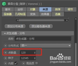 在对象面板中将圆环对象拖到破裂下方酿成其子级。选择破裂对象,属性面板中选择“来历”通道,选择“点生当作器-分布”,下拉并把点的数目点窜为120。