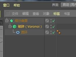 打开C4D软件,睁开对象选择框选择并建立一个圆环对象,属性面板中的参数属性按照需要进行调整。在菜单栏中找到并以此选择“活动图形-破裂”选项,添加一个破裂结果器对象。