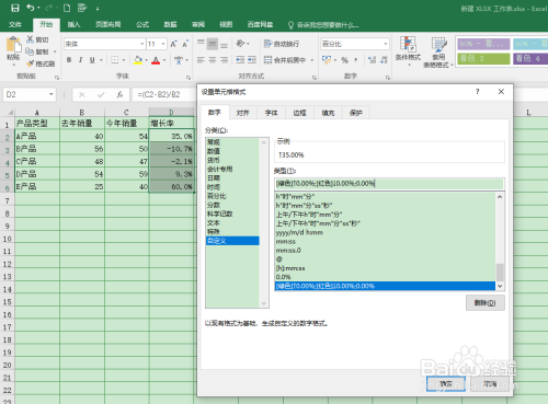 切换自界说面板,输入公式【[绿色]↑0.00%;[红色]↓0.00%;0.00%】,点击确定。