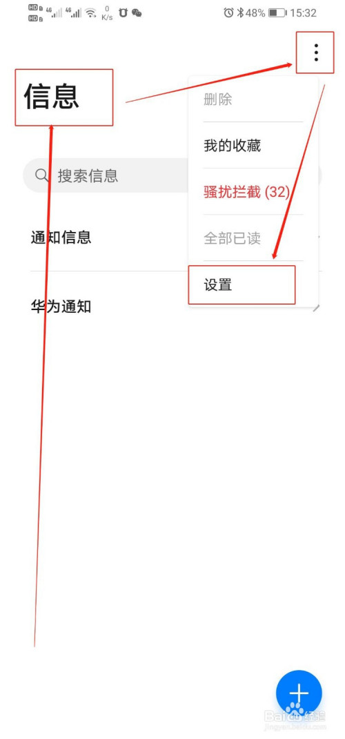 1、打开华为手机自带的短信软件,点击右上角的三个点