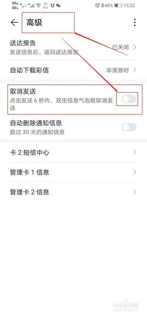 3、点击进入“高级”设置页面,就可以看到“打消发送”的选项;将该选项的开关打开