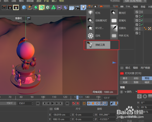 点开灯光的菜单栏,从睁开的列表中找到照明东西,点击。不消点窜此中的参数。