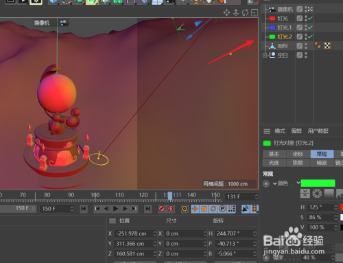 第三种方式是新版软件添加的,可能伙伴都没怎么寄望到。场景中添加了三个分歧角度分歧颜色的灯光。在不退出摄像机视角的环境下如何调整灯光呢?