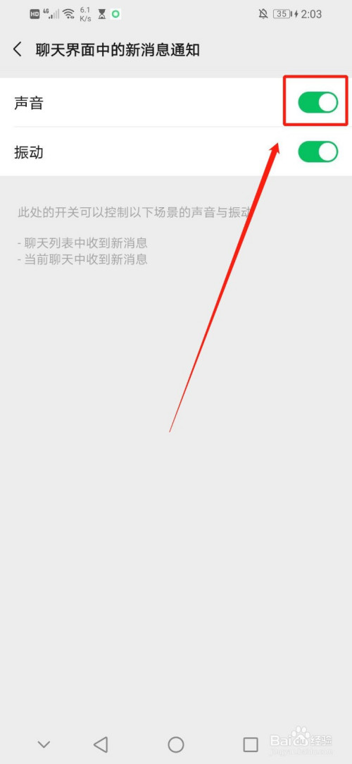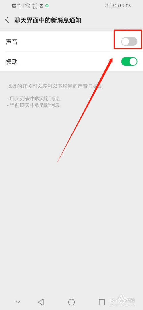 7.当白色圆圈标的目的左移动且绿色区域酿成灰色区域即完当作封闭微信聊天里新动静的声音提醒
