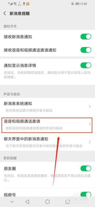 进入“新动静提醒”界面后,点击“新动静提醒”界面第五行的“语音和视频通话邀请”,如图