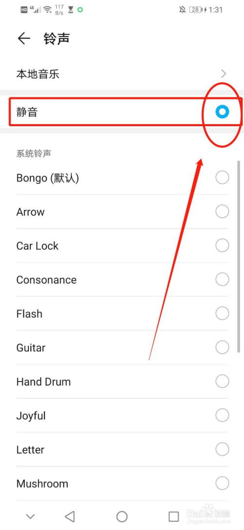 进入“铃声”界面后,点击“铃声”界面第二行的“静音”右边的白色圆圈把它酿成白心的蓝圈就可以,如图