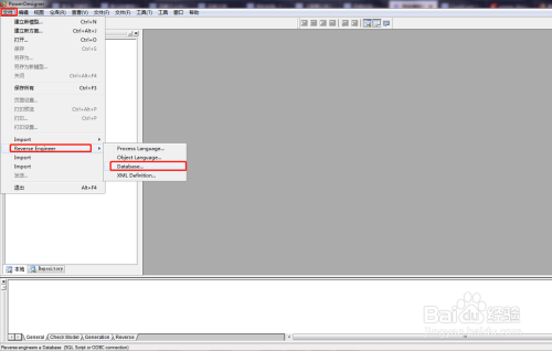 打开PowerDesigner,选择【文件】--【Reverse Engineer】--【DataBase】,如图所示,我的版本有部门汉化,请自行对照菜单名称。