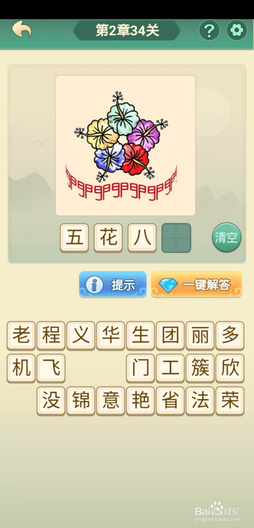 第2章第34关攻略,图中有五朵花和八个门字,本关比力简单,将他们组合在一路就是八门五花,出自《虞初新志·孙嘉淦》;