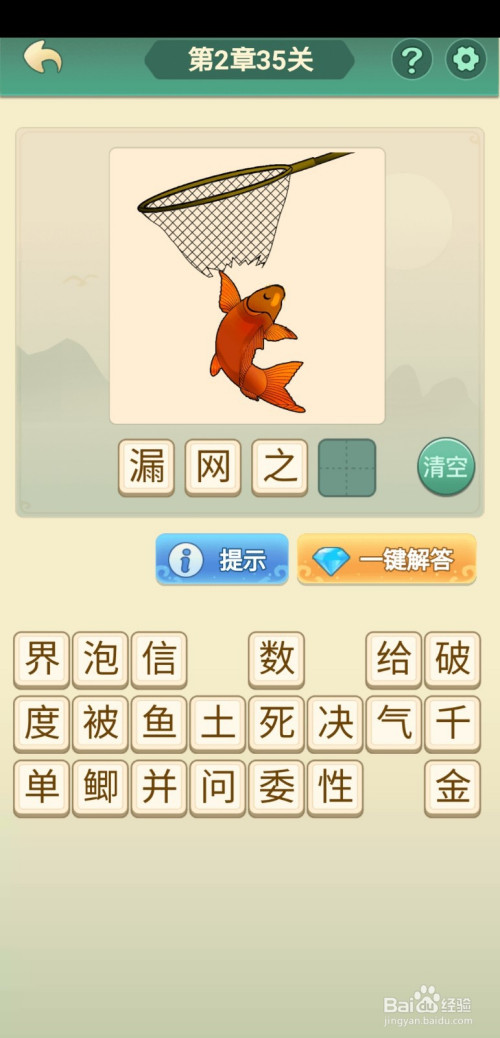 第2章第35关攻略,图中有条鱼,从渔网中失落了出来,本关当作语也比力简单,为丧家之犬,出自晋·陆机《五等诸侯论》。