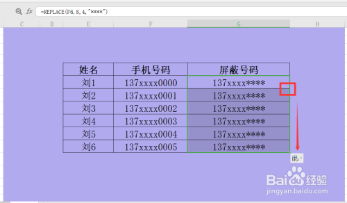 4、标的目的下拉动单位格,完当作数据填充,即可批量屏障手机号码后四位。