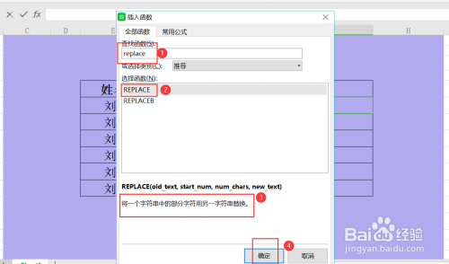 第三步,在函数页面,输入REPLACE,点击搜刮,查看其功能用途后,点击确定;