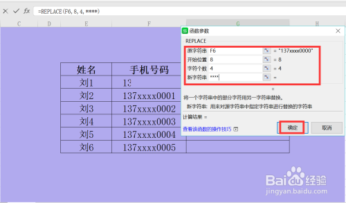 第五步,点击确定后,即可获取输出成果,手机号后4位即可被屏障为设置的****符号,详情如下;