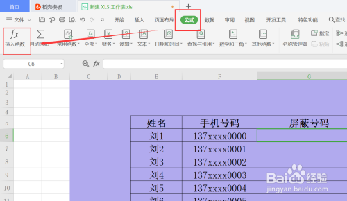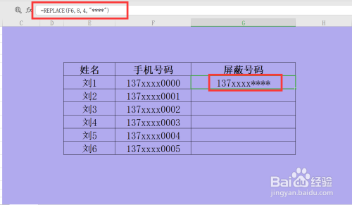 3、输入屏障公式=REPLACE(F6,8,4,"****"),按回车键即可获取成果;