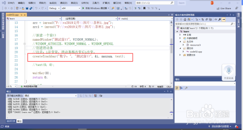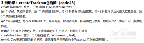 4. 建立滑动条函数共有5个参数,第1个参数是滑动条的名称,第2个参数是建立滑动条的图片窗口,第3个窗参数是滑动条对应的变量,第4个参数是滑动条的最大值,第5个参数则是回调函数的名称