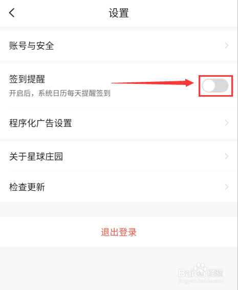 在“设置”页面上,点击“签到提醒”地点行右侧的滑块,使滑块从滑槽左边滑到右边。见下图
