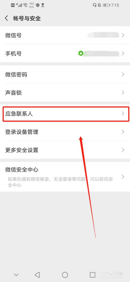 进入“帐户与平安”界面后,点击“帐户与平安”界面第五行的“应急联系人”,如图