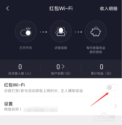 点击打开红包Wi-Fi界面,点击“红包Wi-Fi”的按钮开启这个功能。