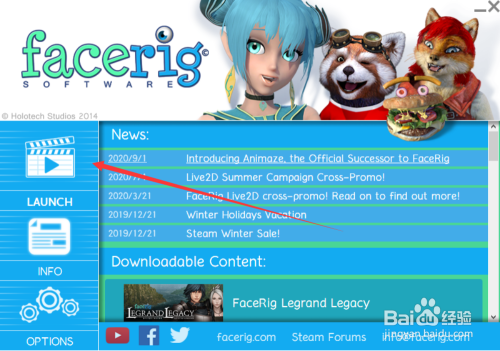 首先,打开Facerig软件,并点击左侧的“LAUNCH”图标,进行软件的启动。