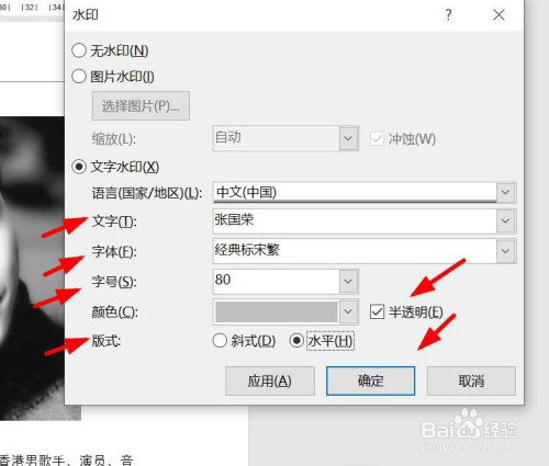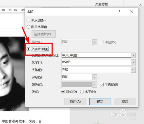 输入水印文字,编纂好字体、字号、颜色、板式等。然后点击“确定”。