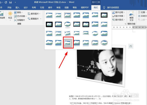 图片插入后,选中图片,点击“格局”。点击样式的下拉箭头。