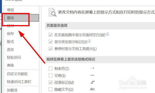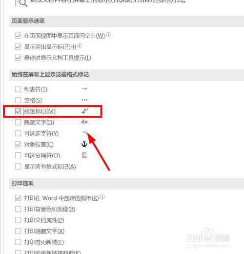 在“段落标识表记标帜”前面,若显示勾选状况,则文档中文字段落可以看到回车符号。若无勾选状况,则文档中只显示文字和符号。无勾选状况如图所示。
