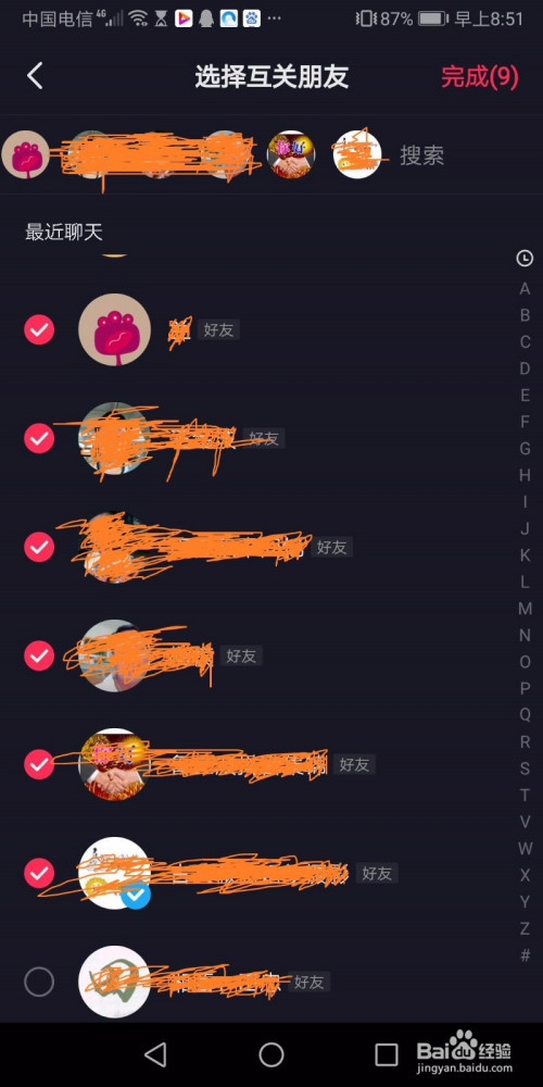 三、勾选老友,点击右上角“完当作”。