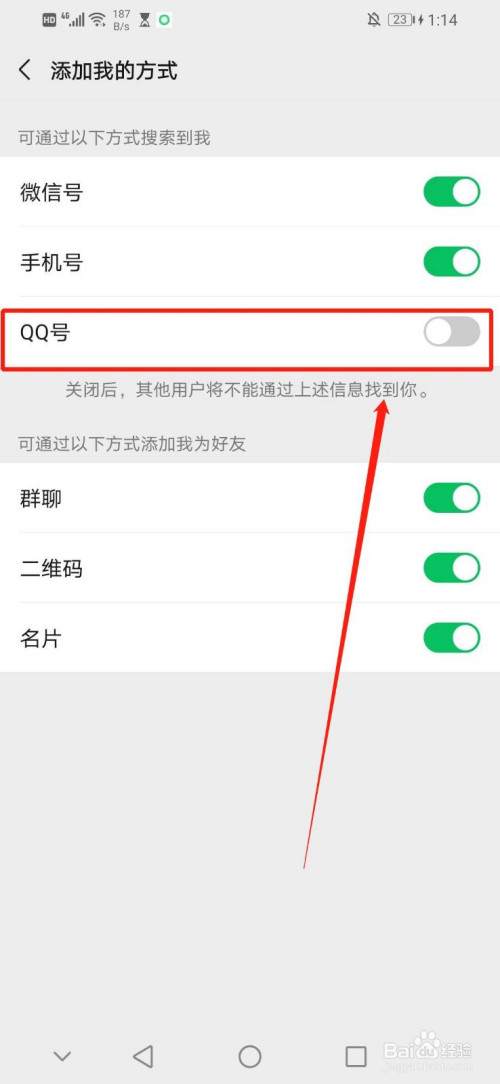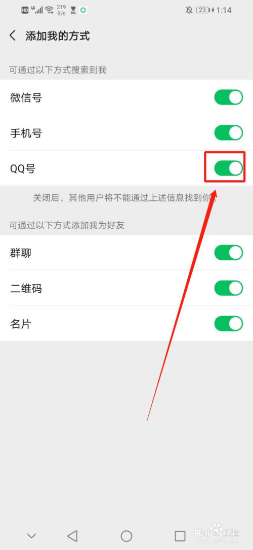 7.白色圆圈标的目的左移动且绿色区域酿成灰色区域的时辰暗示完当作让别人用QQ号搜刮不了我们的微信