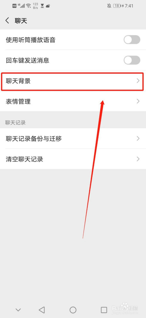 进入“聊天”界面后,点击“聊天”界面第三行的“聊天布景”,如图