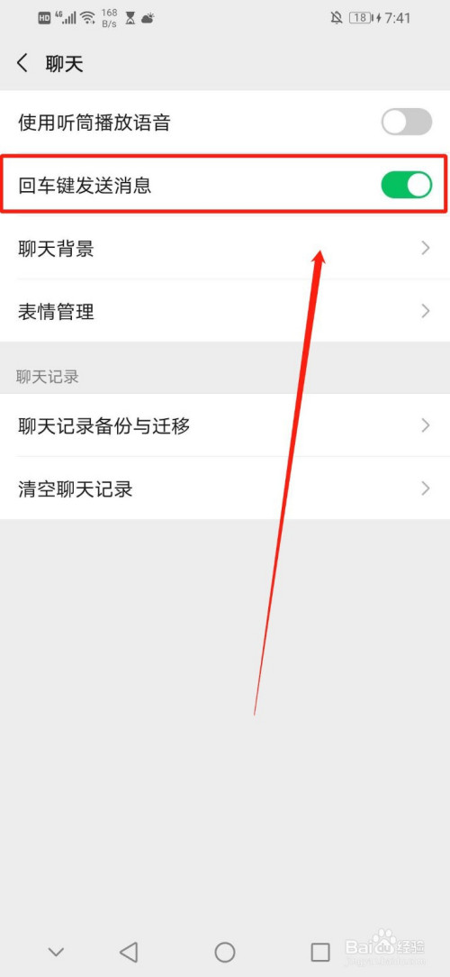 5.点击“聊天”界面第二行的“回车键发送动静”旁边灰色区域白色圆圈