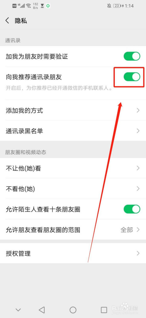 进入“隐私”界面后,点击“隐私”界面第二行的“标的目的我保举通信录伴侣”旁边绿色区域白色圆圈,如图