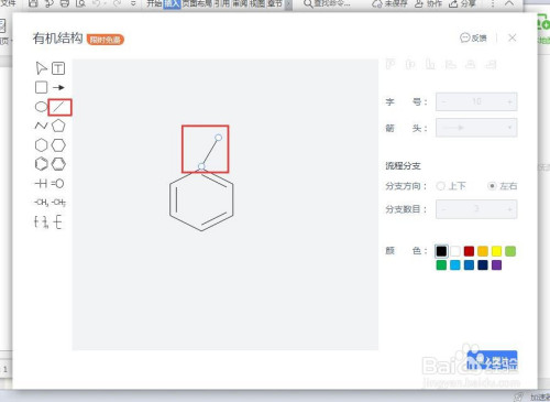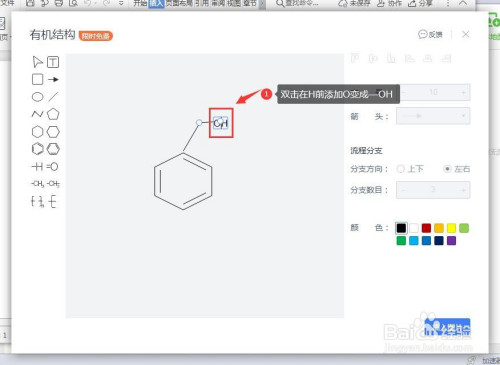 4、点击左侧——直线添加到苯环右上方作为分支,然后再点击选中-OH,添加到——直线另一端。并双击H酿成输入框后,添加O酿成——OH分支。