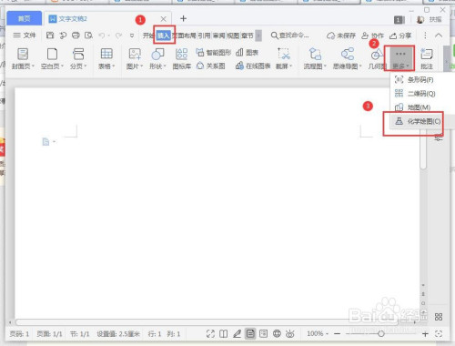 2、点击菜单“插入”,鄙人方点击“更多”,在睁开的菜单中选择“化学画图”点击打开