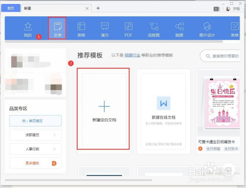 新建空白文档:打开WPS软件,点击“新建”,在菜单栏中选择“文字”,点击“新建空白文档”