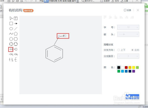 苯甲酸分支-OH绘制:点击左侧——直线添加到苯环右上方作为分支,然后再点击选中-OH,添加到——直线另一端。并双击H酿成输入框后,添加O酿成——OH分支。