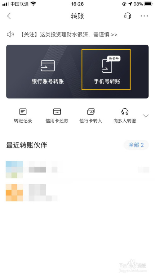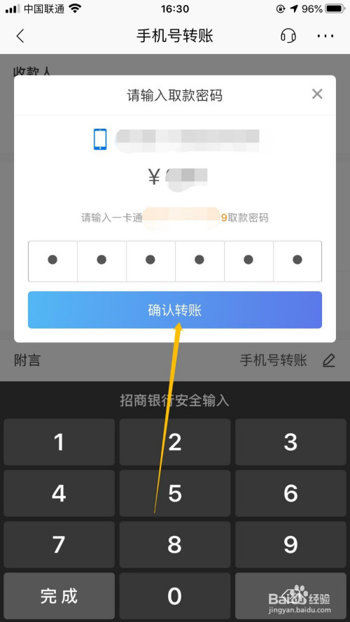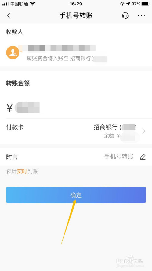 在“手机号转账”界面中,输入转账金额和选择付条目卡,点击“确定”按钮。