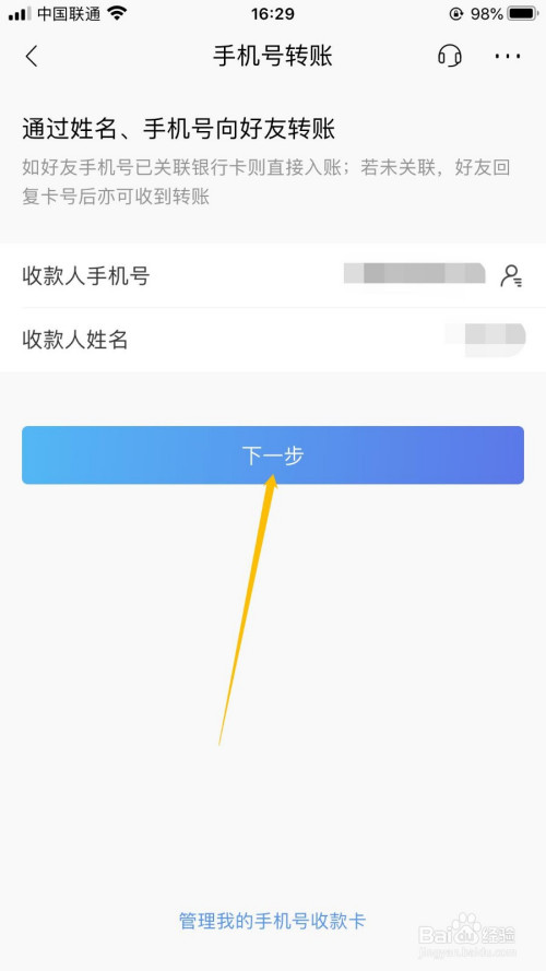 在“手机号转账”界面中,输入“收条目人手机号、收条目人姓名”信息,点击“下一步”按钮。