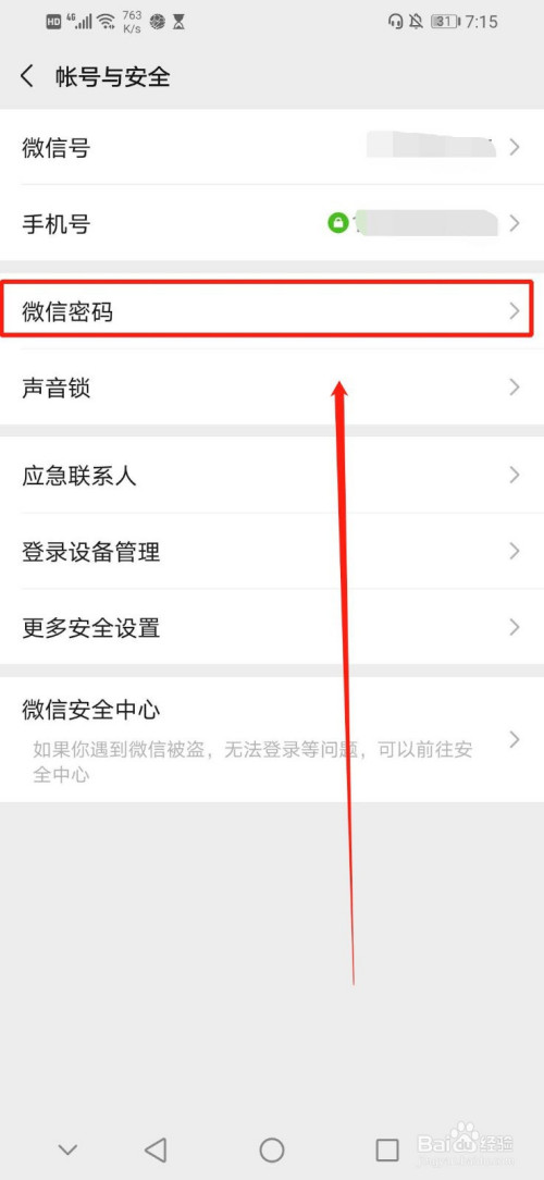 进入“帐号与平安”界面后,点击“帐号与平安”界面第三行的“微信密码”,如图