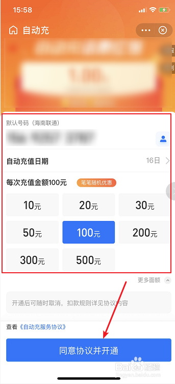 设置充值号码,日期,金额后,点击【赞成和谈并开通】
