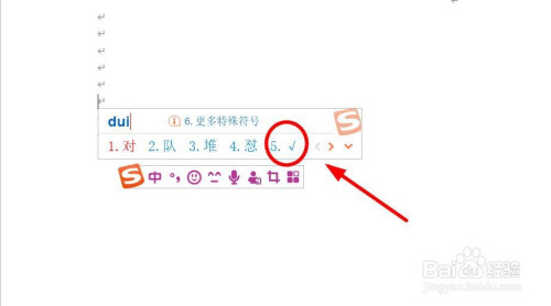输入拼音“dui”,可以看到拼音选项中有打勾图标。