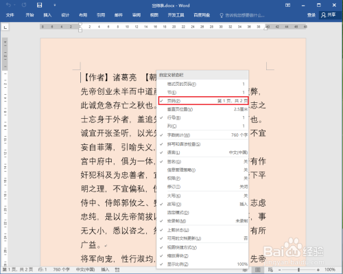①、在状况栏上点击鼠标右键,在弹出的快捷菜单中选择和打消当前文档需要显示的信息。