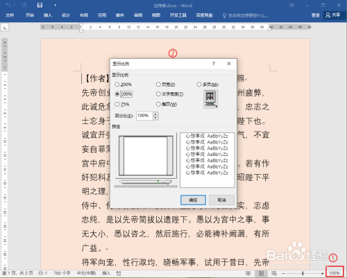 ●位于状况栏最右侧,可快速调整文档的显示比例,例如当前比例为“100%”,可以拖动滑块快速改变显示比例。