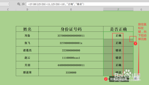 第五步,判定玩刘备的身份证号码长度是否准确后,我们在将鼠标移动到单位格F6右下角,按住鼠标左键,标的目的下拉动单位格,即可完当作批量计较,成果输出如下。