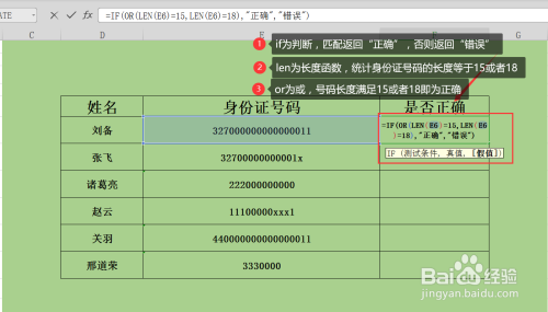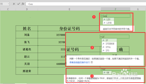 第二步,验证身份证长度是否准确的话,需要利用到三个函数,别离为if(判定函数)、len(长度函数)、or(或函数),三个函数的用途如下图所示;