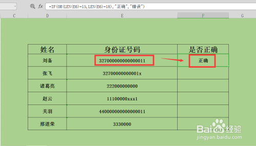 3、F6单位格中输入本次判定的公式=IF(OR(LEN(E6)=15,LEN(E6)=18),"准确","错误");