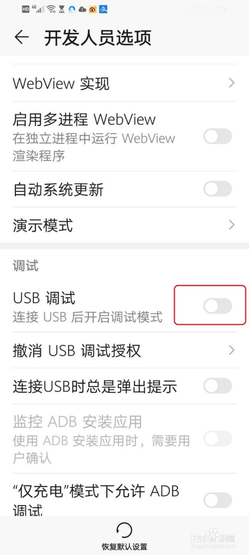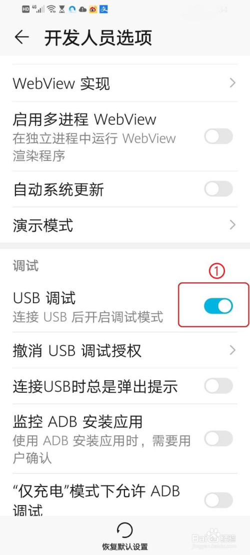 注重:开关显示“灰色”,暗示“usb调试”封闭;开关显示“蓝色”,暗示“usb调试”打开。