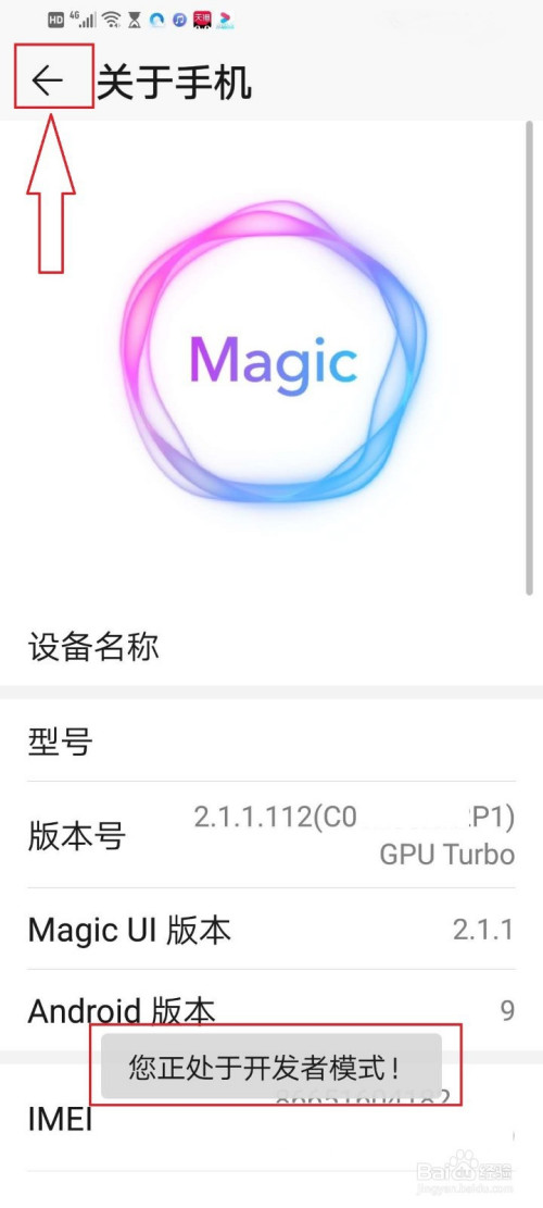 手机遇提醒:您处于开辟者模式,点击左上角的返回按钮。