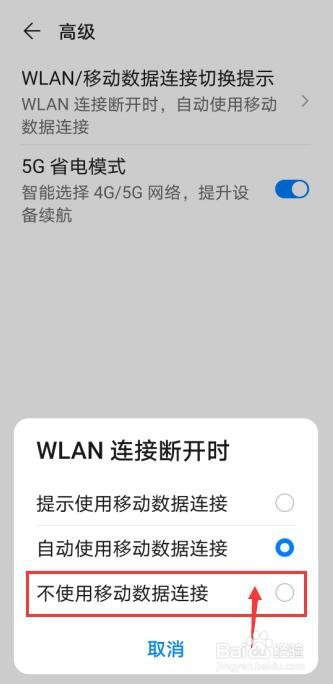 默认是断开WiFi主动利用流量,点击选择【不合用移动数据毗连】即可设置完当作。