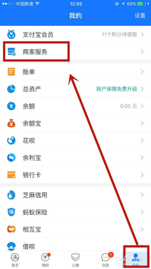 打开支付宝,点击右下角的我的,再点击进入商家办事。