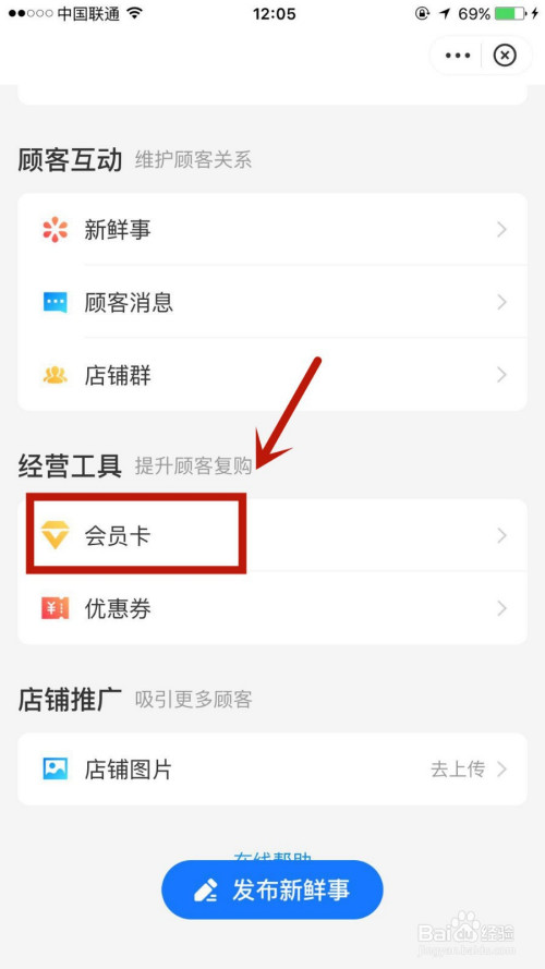 3.点击我的店肆,下滑页面找到经营东西下的会员卡选项进入。