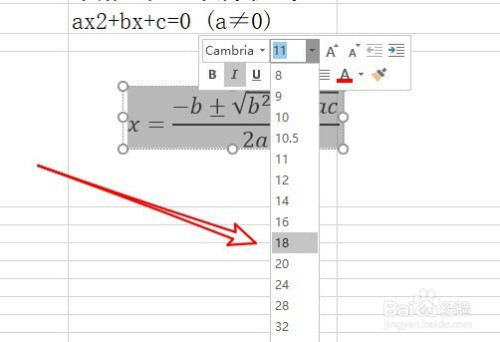 可以点击选中二次公式,设置公式的字号与字体。